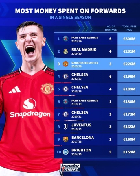单一赛季锋线引援花费榜:曼联今夏花2.26亿欧第三,巴黎皇马前二