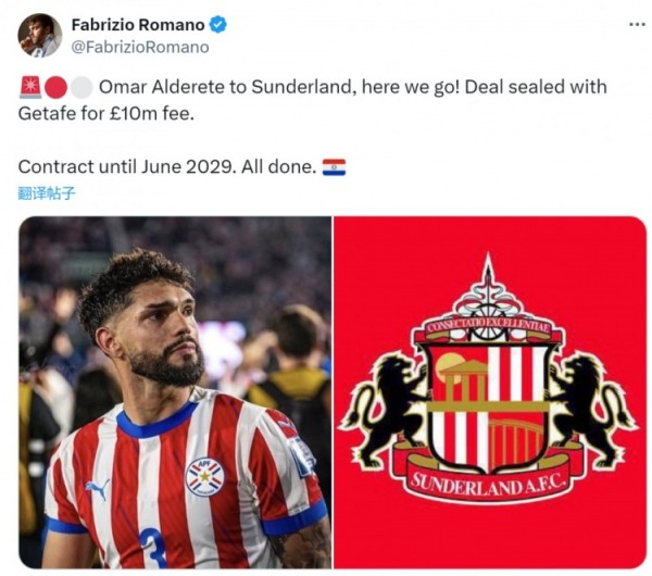 罗马诺透露,桑德兰已经敲定引进阿德雷特的交易,转会费1000万英镑,这位28岁的中卫将与桑德兰签约至2029年6月份。