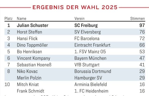 8月11日讯 弗赖堡主帅舒斯特尔当选2025年德国最佳教练,《踢球者》公布得票详情,舒斯特尔97票居首,斯蒂芬、弗里克二三位。