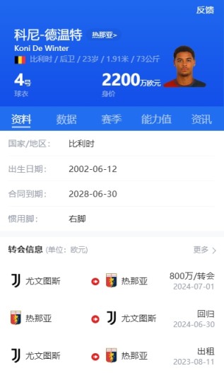 德温特现年23岁,比利时籍,身高1米93,上赛季为热那亚出场26场,身价2200万欧元。
